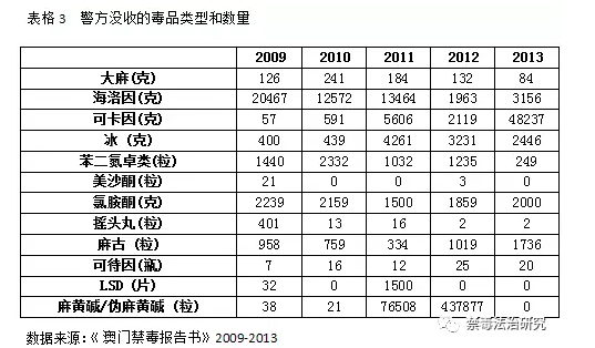 表格3列举了警方从2009年至2013年没收的药物种类和数量。因测量单位的差异,虽不能将表格中的每种药物数量进行直接比较,但整体情况与表格2显示的结果相近。依克计算,数量最多的是可卡因,其次是海洛因、冰和氯胺酮。依粒数为计量单位,最多的是苯二氮卓类和麻古。虽然海洛因数量仍然较大,但已呈逐年下降的趋势,而新型毒品冰和氯胺酮在近三年内始终维持较高的数量。近年来,可卡因数量的重大变化令人堪忧。2009年,警方缴获的可卡因数量都不足60克。然而,仅2010年一年,就增加至591克,与2009相比,上升了900%。之后的2011年,又有5,606 克被缴获,几乎又增长了近900%。虽然2012年的数量有轻微的下降,但仍是2012年以克数为计量单位时数量最多的药物。2013年,没收的可卡因有48,237克,是去年的23倍。世界范围内的研究证明,可卡因与暴力犯罪的发生密切相关。进入澳门的可卡因数量迅速增加,是澳门未来暴力犯罪数量可能增加的不详预兆。另外,应该引起注意的是,近两年里,警方缴获的麻黄碱和伪麻黄碱数量也有大幅度增加。这些物质是制作派对毒品冰毒的主要原料,它们的增加可能预示贩卖用于制造包括冰毒在内的甲基苯丙胺类活动的频繁。