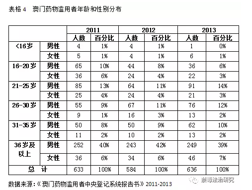 表格4反映了登记在中央系统中的药物滥用者的性别和年龄分布情况。依表格4的数据可知,从2011到2012年,药物滥用者的人数出现轻微下降,但2013年,又有一定回升,总体而言,近三年并没有明显的变化趋势。值得一提的是,中央登记系统中的药物滥用者数量远远高于司法警察局报告的吸毒涉案人数,从侧面反映出澳门自愿戒毒措施鼓励了很多潜在的药物滥用者主动向相关部门寻求帮助。在性别的分布上,女性药物滥用者数量均占总数的19%左右,低于男性药物滥用者数量,且这种比例悬殊的情况在三年里相对稳定,这也说明澳门的男性比女性更有可能产生药物滥用的问题。然而,这种差异在16岁以下的未成年人中体现的并不明显,在2011年和2013年,未成年人女性药物滥用者的数量均高于或等于未成年男性。
