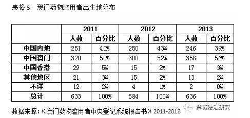 表格5显示了登记的药物滥用者的出生地情况。随着从中国内地前往澳门赌场或其他娱乐场所的人数增加,一种观点认为澳门的药物滥用者以中国内地居民为主。然而,我们无法通过表格5的结果证实这一观点。从2011年至2013年间,药物滥用登记者中出生地是澳门的占50%以上,而且即便是出生地在中国内地,很多也已经取得澳门居民身份。当然,这一发现并不一定意味着多数药物使用或滥用者是本地居民。赌场的游客可能使用非法药物,也可能比本地居民更多使用非法药物,但是这些游客大多数不能在澳门停留过久的时间,不能接受澳门本地的药物治疗服务。因此,他们可能不会出现在中央登记系统中。