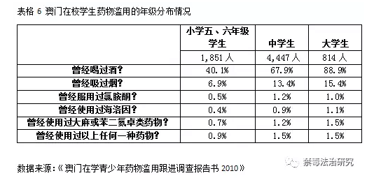 澳门政府一直比较关注未成年人和青年人的药物滥用情况。因而,也资助了两个阶段性的大规模调查用于监督青少年人群的药物滥用情况:一个是“澳门在学青少年药物滥用跟进调查”,另一个则是“澳门街头青少年药物滥用调查”。它们互为补充,分别针对两类不同背景的青少年主体,前者调查的对象是澳门各个年级的在读学生,其中包括小学、中学、高中和大学,而后者的调查对象则是辍学或其他原因未在学校上学的青少年。 “澳门在学青少年药物滥用跟进调查”的主要目的在于确定受访学生的药物滥用程度和模式,发现影响成瘾行为的相关因素。具体而言,该项目已于2001/2002年、2006年、2010先后展开了3次,第4次的调查也正在进行中。本文中只针对最近期的2010年数据进行分析。表格6显示了有过吸烟、饮酒和非法药物滥用行为的青少年受访者在每个年级的分布情况。总体而言,澳门青少年中有过非法药物滥用行为的比例较低,使用过氯胺酮、海洛因或大麻在内的任何一种药物的高小学生17人,占小学生样本总数的0.9%,中学生66人,占中学生样本总数的1.5%,大学生2人,占大学生总数的1.5%,中学生的药物滥用人数最多,但所占比重与大学生相同此外,在青少年群体中,吸烟的比例也相对较低,有7%的高小学生、13%的中学生和15%的大学生。但是,饮酒行为却较为盛行,有过饮酒行为的学生数量远远超过吸烟和药物滥用的数量,分别有40%的高小学生、68%的中学生和89%的大学生有过饮酒经历,尤其对于高小学生而言,40%的比例有些过高。