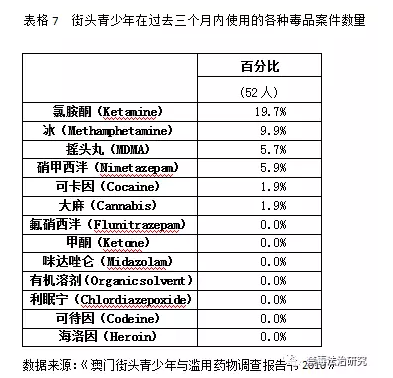 “澳门街头青少年药物滥用调查”之前进行过三次。该研究的调查对象是年龄介于14岁至24岁之间,处于上学年纪却没有上学的青少年。一般而言,调查这些青少年的地点主要是街头、公园、运动场、网吧和快餐店。在最近的2010年报告中,研究团队抽样调查了250名青少年,其中有52%的青少年提供了关于过去三个月药物使用情况的信息。表格7列举了这些青少年涉及不同种类非法药物的案件比例。结果显示,在2010年受访的街头青少年中,20%的人在过去三个月内曾使用过氯胺酮,10%的人使用过冰,6%的使用过摇头丸或硝甲西泮,2%的人使用过可卡因或大麻。前四种常用的非法药物均属于合成类药物,说明新型毒品在街头青少年中较为盛行,而可卡因和大麻等传统药物的使用频率减少。此外,中央登记系统中滥用频率最高的海洛因,也没有出现在街头青少年的滥药类型中。