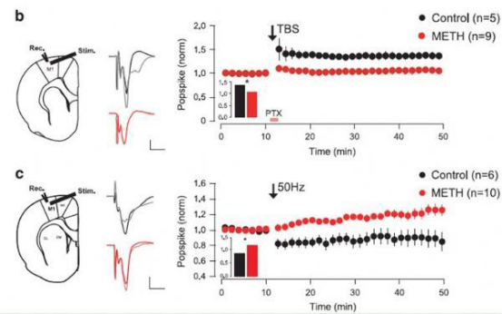 这项研究中,研究人员首先在甲基苯丙胺(冰毒)自身给药的大鼠模型上进行了行为学研究与电生理记录,特异性地鉴定了皮层到背外侧纹状体通路的可塑性损伤。他们发现,可塑性损伤的可能分子机制是突触上出现了含有GluN3A蛋白的NMDA受体。该类受体对钙离子通透性较弱,因此会极大地改变突触可塑性。该可塑性相对应的运动学习功能也受到了扰乱。
