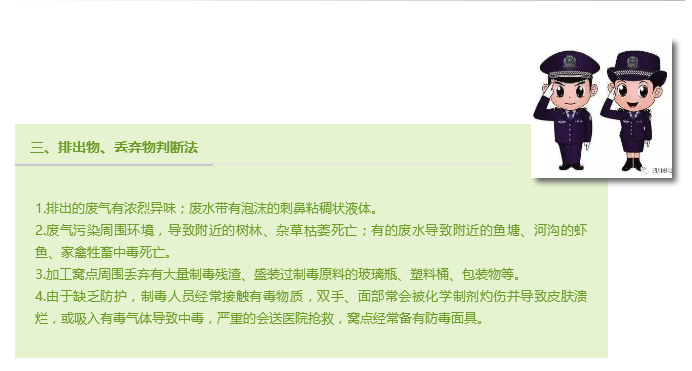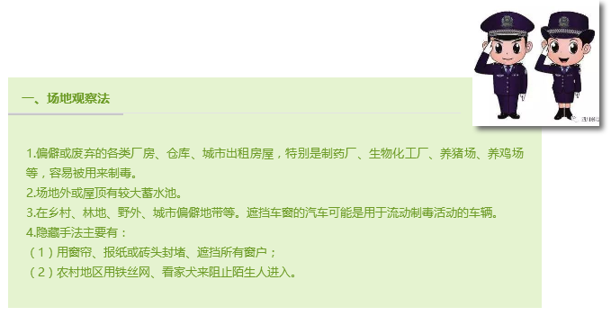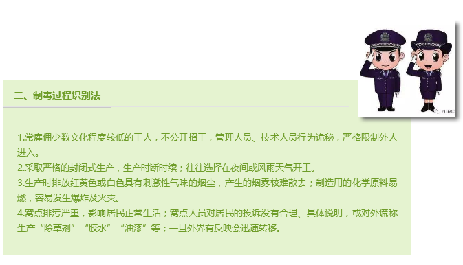 经过多年的生态保护工程和城镇化建设,一些地区出现了越来越多的无人居住的工棚、废旧厂房、老房子和无人林区,犯罪分子正是看上这点,妄图在这些地点建设制毒窝点,警方严阵以待,重拳严打。接下来,我们再复习一遍,如何发现制毒场所!