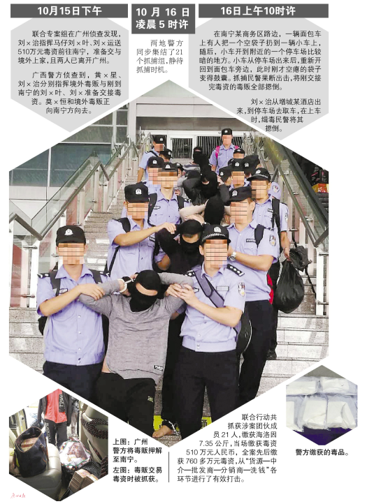 广州警方通报:近日,在公安部禁毒局、广东省公安厅的统筹指挥下,广州警方联合广西南宁警方侦破了一宗公安部目标毒品案件,摧毁一个跨境并在广西南宁、崇左、钦州、广东广州等地进行走私、运输、贩卖海洛因犯罪组织网络,抓获涉毒嫌疑人21人,其中外国籍人4人,缴获海洛因7.35公斤,毒资760万元,以及涉案车辆10辆。本报记者跟随专案组全程直击广州、南宁两地交接毒贩,揭秘穗邕两地警方联手摧毁这一特大跨境毒品犯罪网络背后的故事。