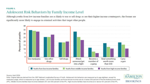 美国的一项调查显示,出身低收入家庭的孩子(深绿色)更容易在青春期参与和毒品相关的高风险犯罪活动丨BROOKINGS