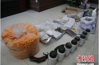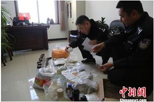 民警当即采取行动,并对整个房间进行严密搜查。民警在卫生间现场查获冰毒成品、半成品72.4克,海洛因0.23克,红磷、碘、丙酮清洗剂、氢氧化钠颗粒等化学品和电加热套、烧杯、滤纸、漏斗、温度计等若干化学仪器。