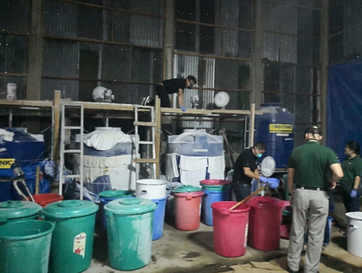 中国禁毒网讯 4月12日凌晨5时,中菲两国禁毒部门通力协作,联手开展缉毒执法行动,在菲律宾八打雁省伊班市希俄索农场捣毁制毒工厂1处,在菲律宾抓获犯罪嫌疑人7名(中国籍4名、菲律宾籍3名),在福建抓获犯罪嫌疑人4名,缴获冰毒半成品和制毒原料及设备一批。该案是菲律宾杜特尔特总统上任以来,中菲两国联合在菲国境内成功破获的第一起特大制贩毒案件,体现了两国缉毒执法部门高超的指挥水平和精准的行动能力,彰显了两国政府维护本地区安全稳定、严厉打击毒品犯罪的态度与决心。