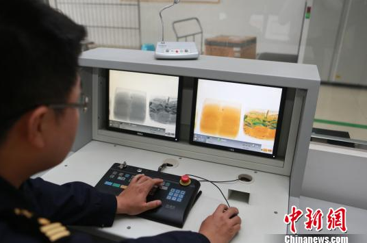 一海关关员通过Ⅹ光机成像发现邮包过机图像异常。 俞波 摄