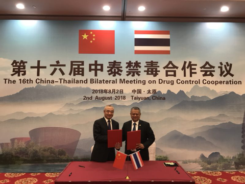 8月2日,第十六届中泰禁毒合作双边会议在山西省太原市举行。图为中泰双方签署《泰国肃毒委员会办公室向中国国家禁毒委员会办公室提供毒品样品交接书》。