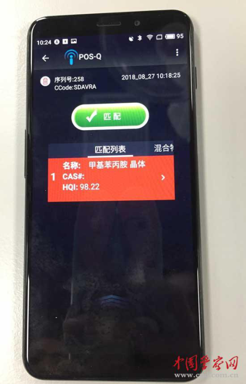 “红色报警信号,含甲基苯丙胺,毒品!”5月16日,黄石市公安局黄石港分局民警将一包红色药片对准一台小巧的黑色块状仪器顶端的检测端口后,点击配套手机界面的“扫描”,仅仅过了10秒,手机便“报警”,显示该药片含有毒品甲基苯丙胺成分。面对结果,起初还嘴硬的男子低下了头,交代了自己违法携带毒品的事实。