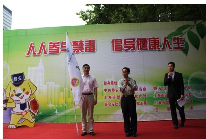 活动现场,上海市禁毒科普教育馆馆长汤钧向静安区活动代表授了营旗。市禁毒办主任王军,静安区委副书记韩强,区委常委、区委政法委书记、区禁毒委主任凌惠康,市法学会禁毒法研究会会长周伟航,市自强社会服务总社总干事厉济民,静安区委政法委副书记、禁毒办主任姜冬冬等领导出席活动。区综治办、街道分管领导、禁毒社工、社区居民及楼宇白领志愿者等150余人参加活动。市禁毒科普教育馆的禁毒宣传车也在现场接受市民参观,传播禁毒科普知识。