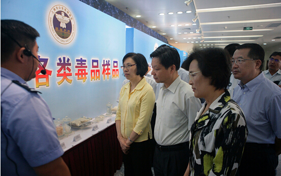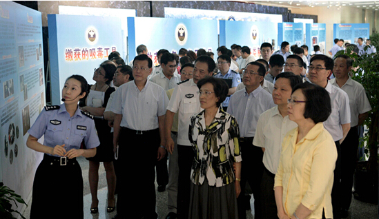 在市公安局刑侦总队展示区,相关人员向视察人员介绍了在缉毒工作中用于检测、探测和侦查的毒品人体生物样本检测箱、手持式拉曼光谱毒品识别仪等,并进行了演示。除此之外,公安部门收缴的制毒、吸毒工具以及冰毒、摇头丸等毒品,也给参观者留下深刻印象。