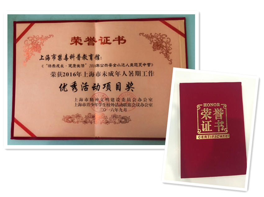 上海市禁毒科普教育馆组织开展的“快乐成长 健康生活”2016年公共安全小达人主题夏令营活动,被上海市精神文明建设委员会办公室、上海市青少年学生校外活动联席会议办公室评为2016年上海市未成年人暑期工作优秀活动项目奖。