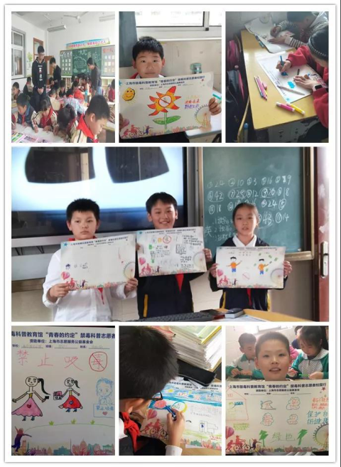铺好绘画纸张,手舞画笔刷,有一群孩子们集思广益地发挥着自己丰富的想象力,以独特的视角创作了一幅幅关于禁毒主题的画作。此次禁毒志愿者活动正是由上海市禁毒科普教育馆主办,上海市志愿服务公益基金会资助的公益性项目,2018年我们组织开展“禁毒绘画秀”、“禁毒科普小讲堂”、“禁毒问卷调查”等活动,派出7大片区25支禁毒志愿者队伍分别前往打铁桥小学、童梦小学、博奥利星行小学、育才小学、山海小学、永悦小学、弘梅小学等7所学校,参与活动的外来务工人员的孩子们达到440人次。