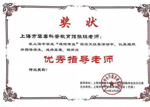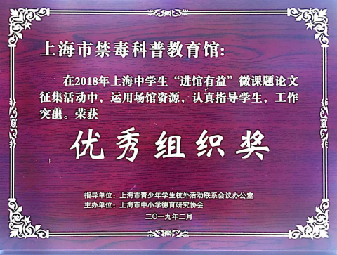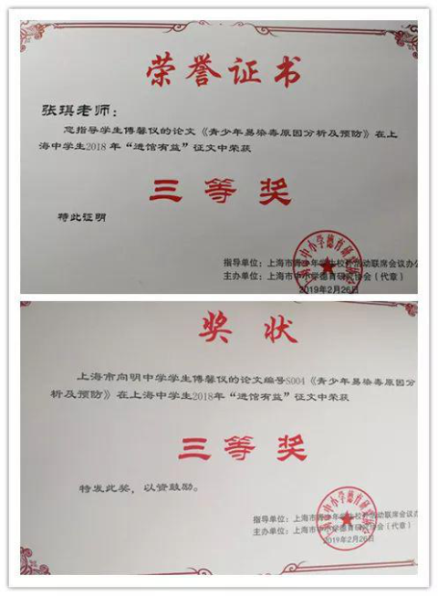 由本馆参与指导,上海市向明中学傅馨仪同学撰写的《青少年易染毒原因分析及预防》微课题研究论文荣获三等奖。