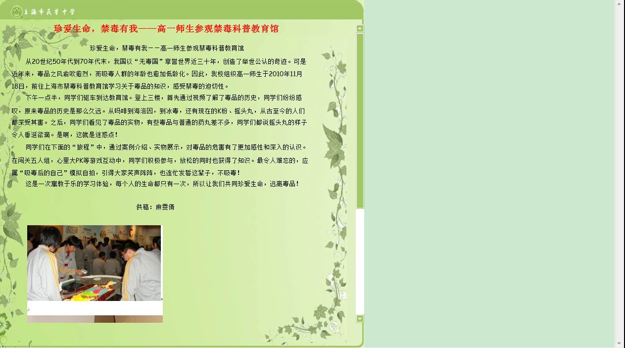 下一篇:上海市自强社会服务社-江宁街道禁毒社工带领戒毒人员参观市禁毒科普教育馆 2010.11.… (2010/11/18)