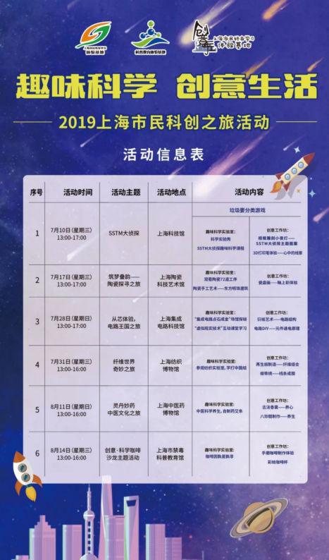 请大家及时关注“上海科普教育”、“创意手工体验基地”微信公众号,我们会发布招募推文,你们可以通过报名参加,请敬请关注,具体活动安排详见下图