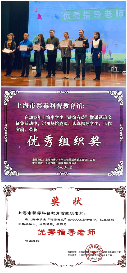 上海市禁毒科普教育馆获得优秀组织奖,由本馆参与指导,上海市向明中学傅馨仪同学撰写的《青少年易染毒原因分析及预防》微课题研究论文荣获三等奖。本馆宣教员张琪被评为优秀指导老师。