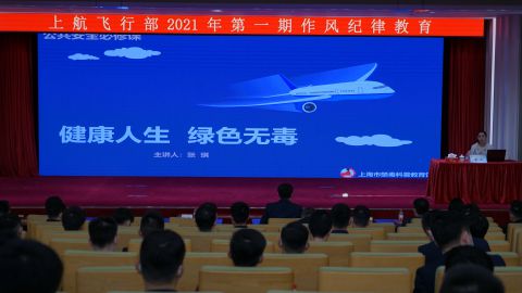 2021年4月9日,宣教员张琪在上海航空有限公司飞行部主讲“公共安全必修课”,听讲人数140人。