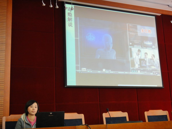2011年12月1日,讲解员杨颖在上海健康职业技术学院主讲禁毒流动课堂,听讲人数120人。