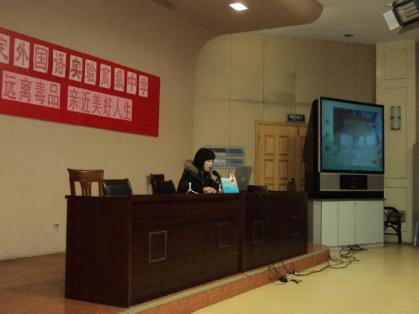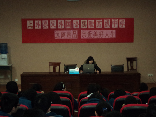 2012年3月2日,讲解员周颖在上外嘉定外国语实验高中主讲“远离毒品,亲近美好人生”的禁毒流动课堂,听讲人数846人。