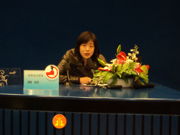 2012年3月13日,讲解员周颖在闸北区市北中学主讲禁毒流动课堂,听讲人数1030人。