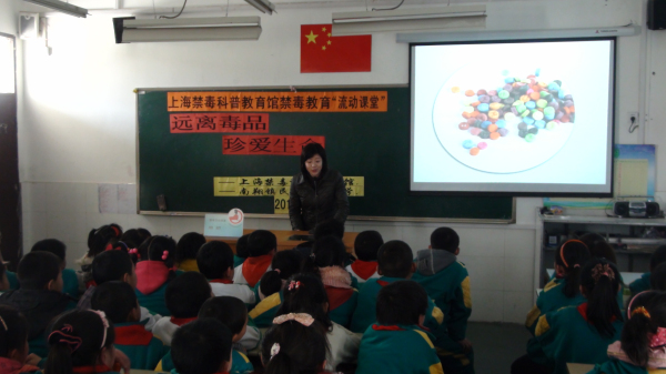 2012年3月21日,讲解员周颖在嘉定区民办桃苑小学主讲禁毒流动课堂,听讲人数120人。
