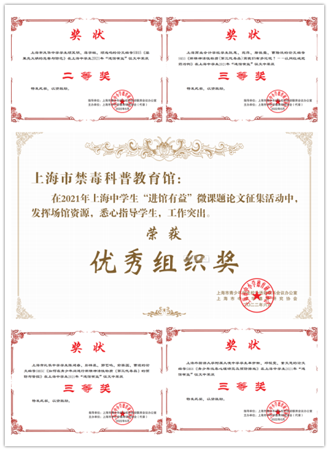 在上海市青少年学生校外活动联席会议办公室、上海市中小学德育研究协会主办的第八届“文化根·民族魂·中国梦”——“进馆有益”微课题研究论文征文活动中,上海市禁毒科普教育馆荣获优秀组织奖。由我馆参与指导,上海市风华中学顾笑明等同学撰写的《罂粟壳火锅的危害与防范》论文荣获二等奖,上海市比乐中学陈廷睿等同学撰写的《如何在青少年间进行新精神活性物质(第三代毒品)的预防与管控》等3篇论文荣获三等奖。征文活动引导中小学生参与《新精神活性物质离我们有多远》、《青少年吸毒心理研究及预防措施》等接地气、有温度、重实效的课题研究,更好地实现了禁毒科普和教学相长双重功能。