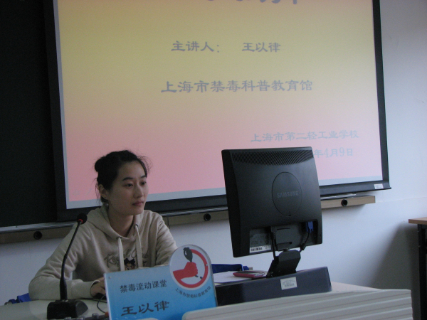 2012年4月9日,宣教员王以律在上海市第二轻工业学校主讲禁毒流动课堂,听讲人数1500人。