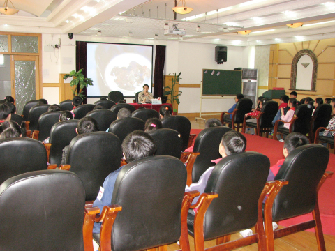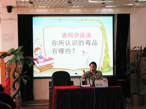 2014年4月29日,宣教员张琪在上海市静安区西康路第三小学主讲禁毒流动课堂,听讲人数599人。