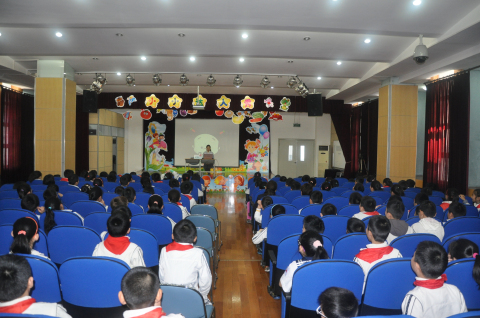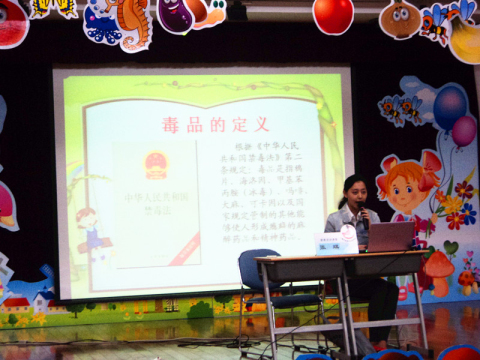 2014年5月12日,宣教员张琪在虹口区第一中心小学主讲禁毒流动课堂,听讲人数200人。