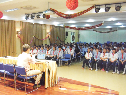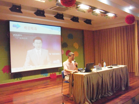 2014年6月23日,宣教部部长邓建业在天山二中主讲禁毒流动课堂,听讲人数450人。