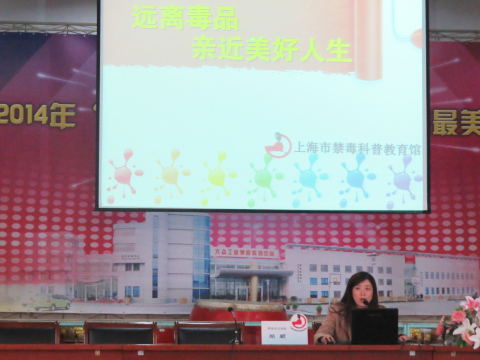 2014年11月27日,宣教员周颖在上海市大众工业学校主讲禁毒流动课堂,听讲人数700人。