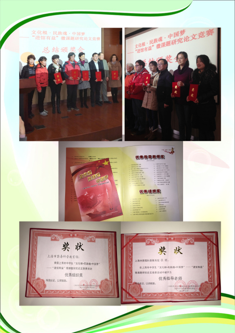 3月7日,上海市青少年学生校外活动联席会议办公室、上海市中小学德育研究会在南洋中学召开了“文化根·民族魂·中国梦”——“进馆有益”微课题研究论文竞赛总结颁奖会。由本馆参与指导,上海市第六十中学李心怡等同学撰写的《如何在高中生中开展更有效禁毒宣传及预防》等5篇微课题研究论文荣获一等奖,本馆荣获优秀组织奖,本馆副馆长张聪被评为优秀指导老师。