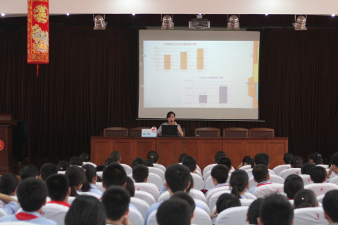 2015年10月16日,宣教员张琪在上海市第一中学主讲禁毒流动课堂,听讲人数1000人。