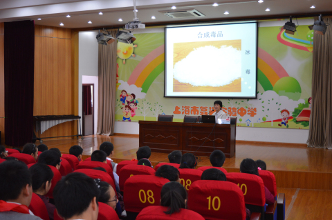 2015年11月20日,宣教员陈方在上海市复兴实验中学主讲禁毒流动课堂,听讲人数425人。