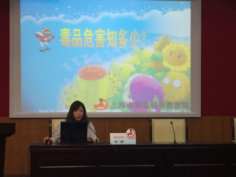 2016年9月22日,宣教员周颖在上海市第八初级中学主讲禁毒流动课堂,听讲人数400人。