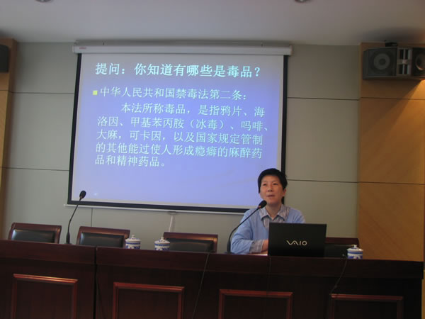 | 2010年6月9日下午,讲解员陈方在闸北区彭浦新村街道主讲题为“如何教育子女不沾染毒品”的禁毒流动课堂,听讲人数85人。 |