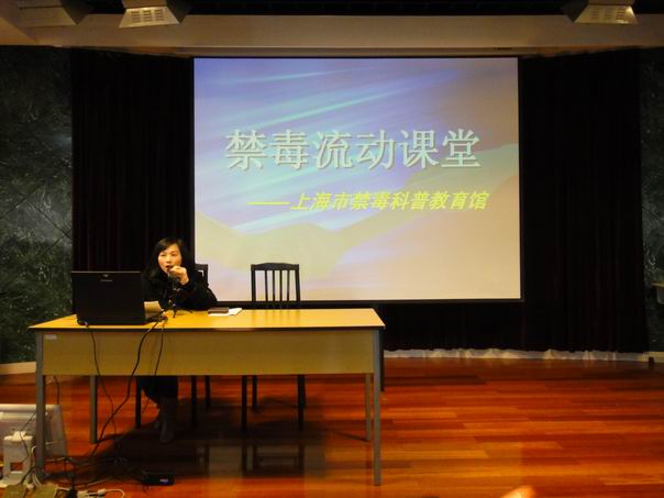 2011年2月24日,讲解员杨颖在长宁区新光中学主讲“珍爱生命,远离毒品”的禁毒流动课堂,听讲师生138人。