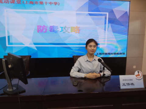 2018年5月18日,宣教员王伟珠在上海市第十中学主讲禁毒流动课堂,听讲人数120人。