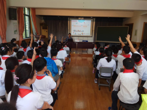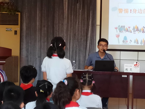 2018年9月28日,宣教员周昊在上海市虹口区外国语第一小学主讲禁毒流动课堂,听讲人数240人。