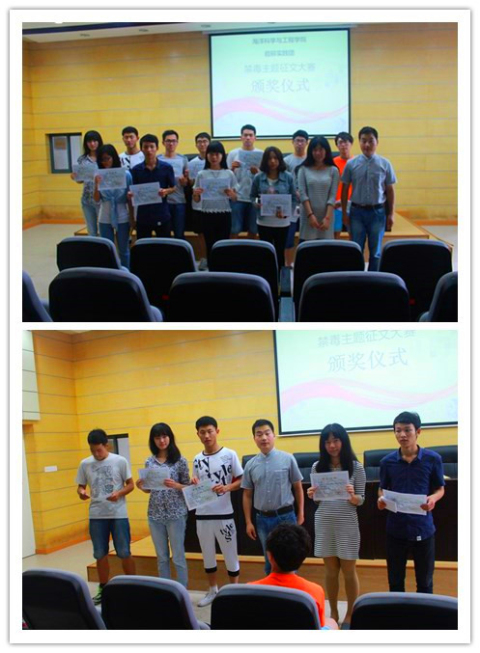 2015年6月17日,由上海海事大学启辰实践团主办的禁毒主题征文大赛颁奖典礼在上海海事大学海洋工程与科学学院109报告厅举行。本次比赛以征文的形式进行禁毒宣传教育,旨在贯彻禁毒方针,用文采为禁毒宣传增添了正能量。启辰实践团希望通过这个活动为上海海事大学的同学们营造一个“无毒校园”。共有83人参与比赛,总计102件作品参赛,经过层层筛选,决出剧本组、歌词组、小说组和诗歌组的一二三等奖,共21位获奖选手,这些获奖作品将于下学期有一个最终展示。