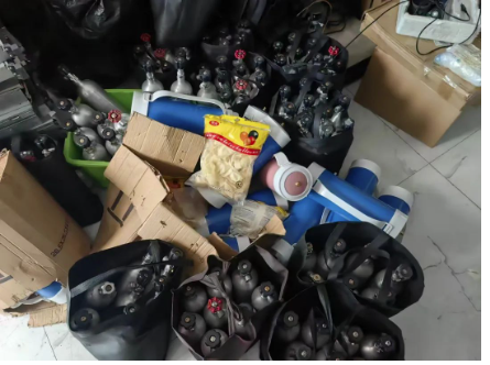 经多方工作,警方确定了该男子身份信息及住址,随后侦查员前往该男子住处将主要犯罪嫌疑人于某涛及其同伙贾某文抓获,查获”笑气“钢瓶50罐。