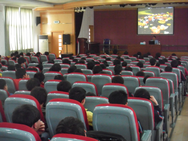 2012年4月20日,宣教部部长邓建业在沪东中华造船集团高级技工学校主讲禁毒流动课堂,听讲人数300人。