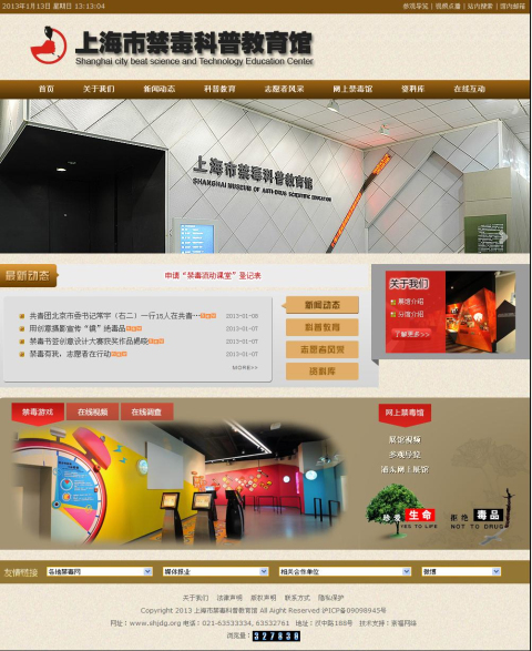 随着科学技术和信息社会的不断发展,越来越多的人通过互联网来学习了解知识和信息,获取资源,为了顺应这一趋势,上海市禁毒科普教育馆自2009年起,开通了禁毒馆网站(www.shjdg.org),至今已近3年时间,目前浏览量已超过32万人次。近日,改版后的上海市禁毒科普教育馆网站全新上线,网站从界面结构、板块设置、互动功能和信息量等方面进行了全面调整,进一步提高禁毒馆网站的吸引力,增强网站的实用性,扩大禁毒宣传的辐射面。