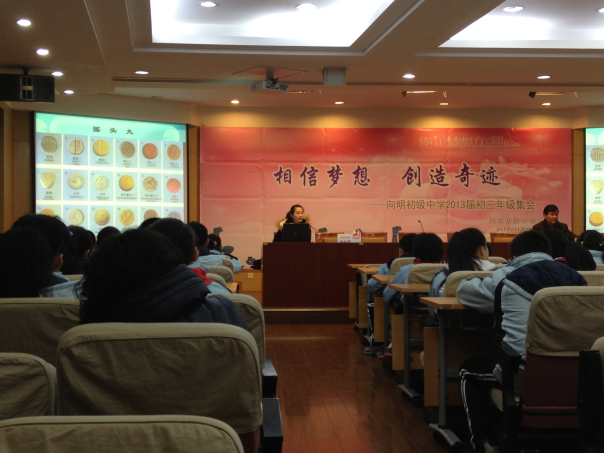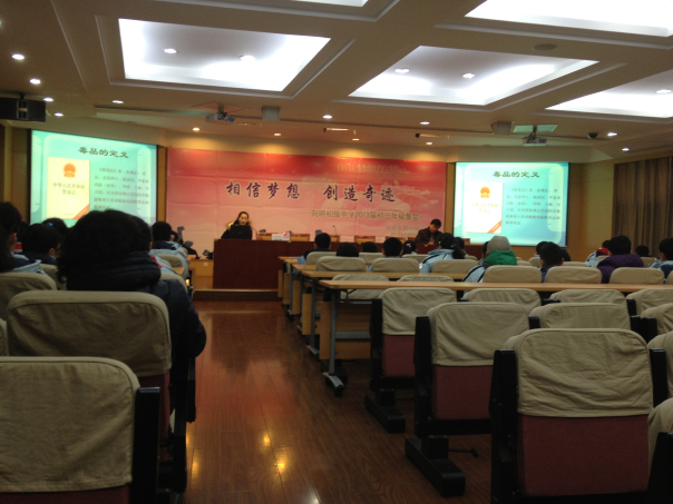 2013年1月22日,宣教员王以律在上海市向明初级中学主讲禁毒流动课堂,听讲人数750人。